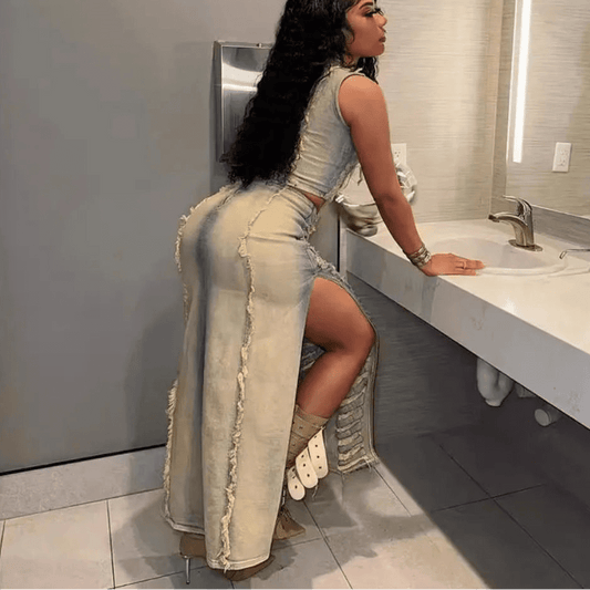 Denim 2-Piece Set - Hollow Crop Top & Slit Skirt Outfit for Women
