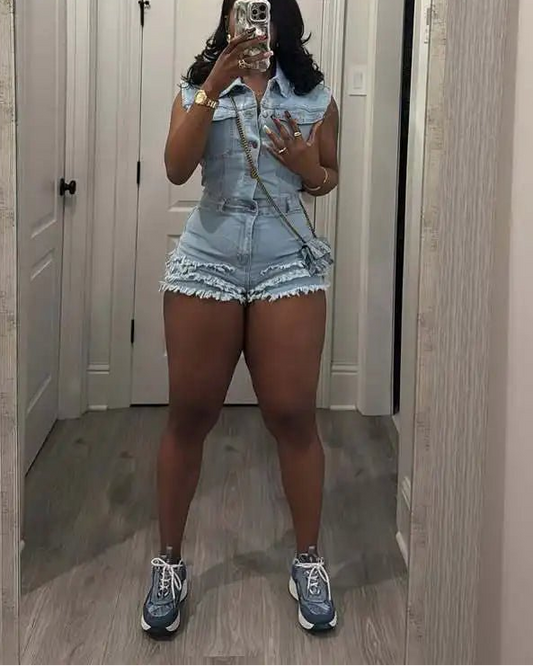 Denim Tassel Short Jumpsuit - V-Neck Romper Playsuit | EverHype