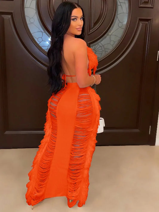 Women's Crochet Beach Set - Halter Crop Top & Tassel Skirt | Sexy Knit Cover-Up