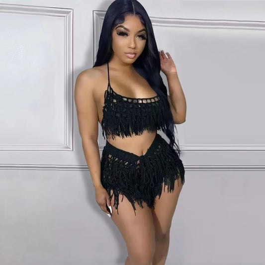 Women's Crochet Beach Set - See-Through Knit Fringed 2-Piece | Summer Vacation Outfit