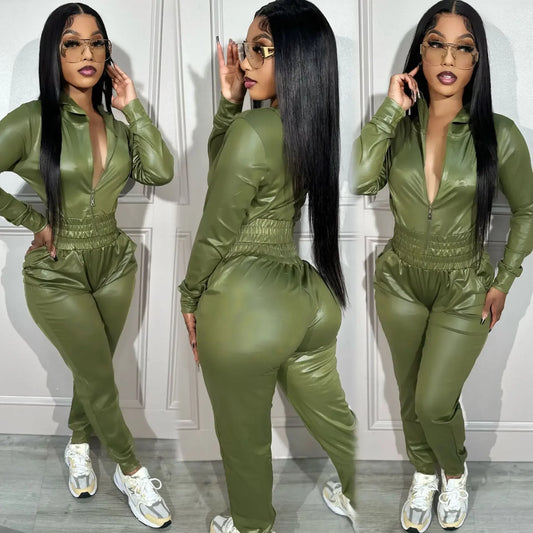 Faux Leather 2-Piece Sweatsuit - Women's Hooded Jacket & Pants Set | Streetwear Outfit